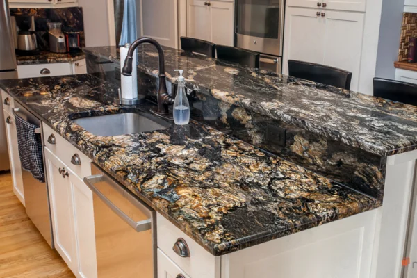 Megma Gold Granite showcases a rich blend of golden, brown, and black tones with flowing patterns, bringing warmth and luxury to countertops, flooring, and accent walls in elegant spaces.